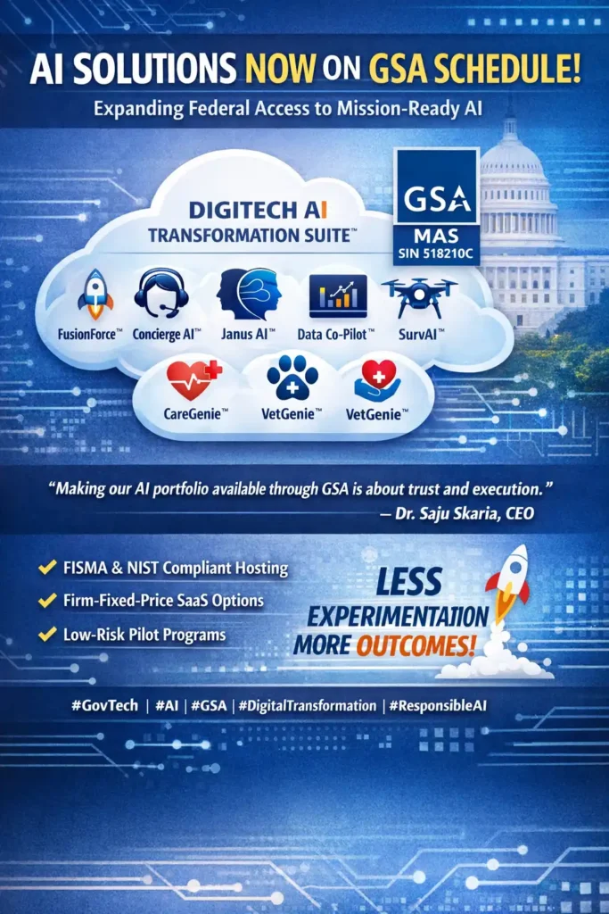 https://www.einpresswire.com/article/887306684/digitech-adds-ai-product-portfolio-to-gsa-schedule-expanding-federal-access-to-secure-mission-ready-ai-solutions Digitech just expanded federal access to our secure, mission-ready AI product portfolio—now officially available on the GSA Multiple Award Schedule (MAS) under SIN 518210C. This means federal, state, and local agencies can procure our cloud-hosted AI solutions through a streamlined, compliant acquisition path—reducing procurement friction, cost, and risk while accelerating modernization. Our SaaS portfolio includes FusionForce™, Concierge AI™, Janus AI™, […]